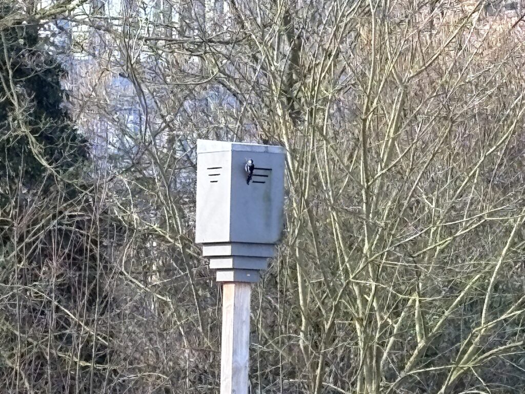 Het mysterie werd al snel opgelost toen we de dader op heterdaad betrapten: een grote bonte specht (Dendrocopos major) zat driftig in te hakken op de paalkast. Maar waarom zou een specht zich richten op een verblijf voor vleermuizen?